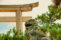Bewaking van de leeuw bij de Torii Gate op Miyajima Island in Japan
