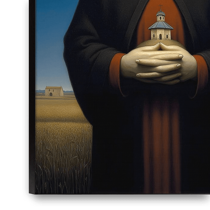 Een strikt frontaal geportretteerde figuur met een oversized, platte hoed staat in een weids, stil landschap. Het gezicht is bleek, bijna maskerachtig, de ogen verborgen in de schaduw. Achter de gevouwen handen draagt de persoon een afbeelding van een kapel op zijn kleding. Het kleurenpalet is beperkt en koel, met sterke contrasten…