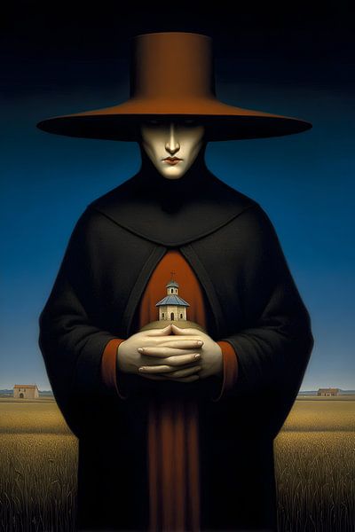 Een strikt frontaal geportretteerde figuur met een oversized, platte hoed staat in een weids, stil landschap. Het gezicht is bleek, bijna maskerachtig, de ogen verborgen in de schaduw. Achter de gevouwen handen draagt de persoon een afbeelding van een kapel op zijn kleding. Het kleurenpalet is beperkt en koel, met sterke contrasten…