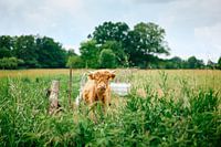 Met trotse kalmte staat het hoogland rund aan de rand van zijn weiland, zijn vacht licht geruwd door de wind, zijn machtige horens geven waardigheid en kracht aan. Het kijkt recht in de camera - kalm, alert en toch met een zachtheid die ontroerend is. Achter hem strekt zich een vredig, weids landschap uit: glooiende heuvels, verspreide bomen en een lucht die een bijna meditatieve kalmte uitstraalt in zijn stille licht.
