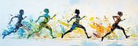 Bewegende Mensen in Kleur - Op dit abstract schilderij zie je vier rennende figuren in verschillende kleuren, die samen een gevoel van beweging en energie uitstralen met spatten van vrolijke kleuren om hen heen.