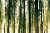 Mystieke foto van een naaldbos met bewegende boomstammen in de wind en een lange sluitertijd. Dynamisch beeld met verloop van bruin naar groen voor grafische doeleinden of achtergond. Ook leuk als behang voor styling of decoratieve mogelijkheden.
