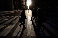 Dit filmische beeld boordevol sfeer richt eerst de aandacht op de vormen van de mensen en vervolgens op de texturen en kijkt vervolgens over straat, een krachtig gebruik van natuurlijke achtergrondverlichting om bewegende vormen te creëren.