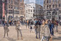 Verschillende foto's geven een overzicht van de Dam in Amsterdam weer. Door de meervoedigebelichting vanuit de camera krijgt de Dam een heel andere uitstraling