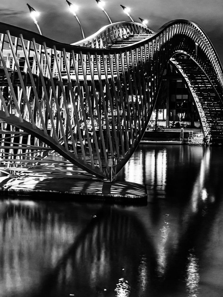 Foto van de Pythonbrug in het Oostelijk Havengebied van Amsterdam. De naam verwijst naar de kenmerkende golvende vorm, als een python in beweging.