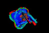 Een bovenaanzicht macrofoto van een tulp uit de tuin, aan het einde van haar bloeicyclus in een gepolariseerd uitzicht.