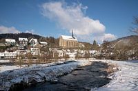 Panoramisch uitzicht op Beyenburg met kloosterkerk in winterlandschap, Wuppertal, Bergisches Land, Duitsland