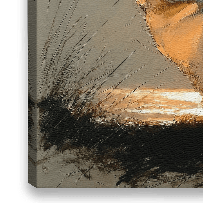 Een kunstwerk met het silhouet van een vrouw die sierlijk aan een kalme zee staat bij zonsondergang. De vrouw draagt ​​een vloeiende, lichtgekleurde jurk die zachtjes wappert in de wind en haar elegante houding accentueert. Haar lichaam wordt verlicht door een warm, goudkleurig licht van de ondergaande zon. De algehele compositie roept…