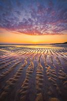 De structuren zorgen voor een mooie lijnenspel wat je naar de horizon en de ondergaande zon brengt. Het natte zand en het achtergebleven zee water reflecteert de kleuren en het licht in de lucht. Mooie wolken blijven voorbij en kleuren rood van de ondergaande zon.