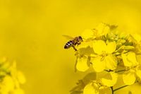 Het gele paradijs van tere koolzaadbloesems vervaagt in een positieve gele achtergrond, met de focus op de vliegende bij die stuifmeel verzamelt.