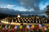 In de late avondzon op de 3100 meter hoge Dochula pas in Bhutan kijken we door een zee van gebedsvlaggen naar het 100 stupa monument