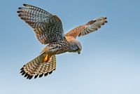 Een jagende totenvalk tegen een blauwe lucht in Chezelle, Frankrijk.