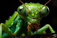 Een macro zoom van een groene bidsprinkhaan. Ultra hoge resolutie. Ochtend dauw neergeslagen op zijn kop. Een prachtige afbeelding in helder groen op een zwarte achtergrond. Wonderlijke natuur in optima forma. Het beste afgedrukt op acrylglas of glanzend aluminium of HD metal.