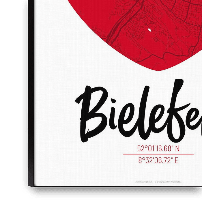 Koop de illustratie Bielefeld - Stadsplattegrondontwerp Stadsplattegrond (hart) van ViaMapia als print op canvas, aluminium dibond, (ingelijste) fotoprint, behang en ArtFrame. Voor jou op maat geprint in Fine-Art kwaliteit.