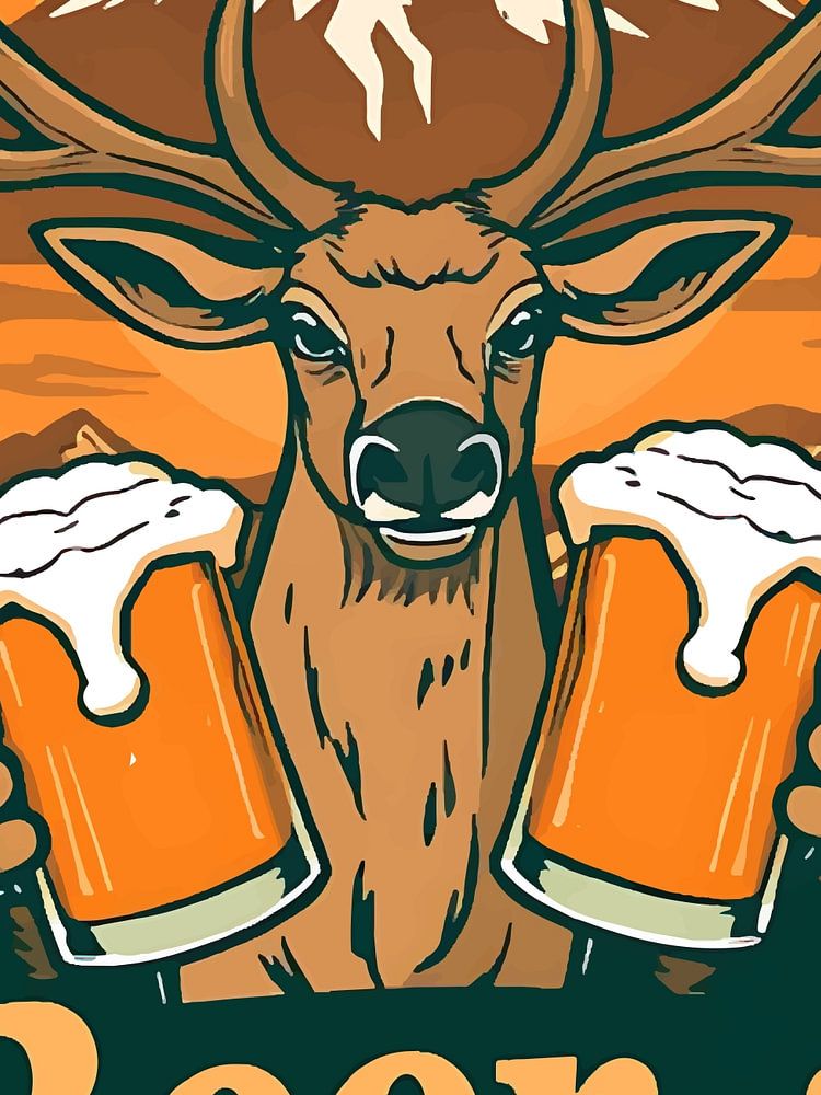 Een rustiek posterontwerp met een vrolijk hert dat twee pullen bier vasthoudt, met bergen en hop op de achtergrond.