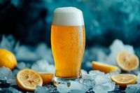 Een verfrissend bruisend bier dat schittert in het glas met een perfect schuimende kroon, omringd door smeltende stukjes ijs en verse schijfjes citroen. Deze aantrekkelijke compositie brengt een gevoel van zomer en gezelligheid in de keuken of eethoek - de ideale blikvanger voor ontspannen avonden met vrienden en familie.