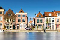 Op de achtergrond van het straatje in het midden is een kerktoren te zien die in de binnenstad staat.