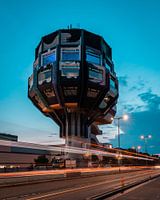 De opvallende Berliner Bierpinsel in Berlijn Steglitz tijdens het blauwe uur. Dit gebouw is niet meer weg te denken uit het Berlijnse stadsbeeld.