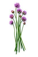 Studio opname met paars bloeiende bloemen, liggend op een witte achtergrond. Decoratieve keuken stilleven. Uit de serie keukenkruiden.