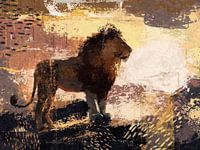 Over ‘Big 5 - leeuw in ruwe tekenstijl - zonsondergang in oranje taupe en zwart’ van Emiel de Lange