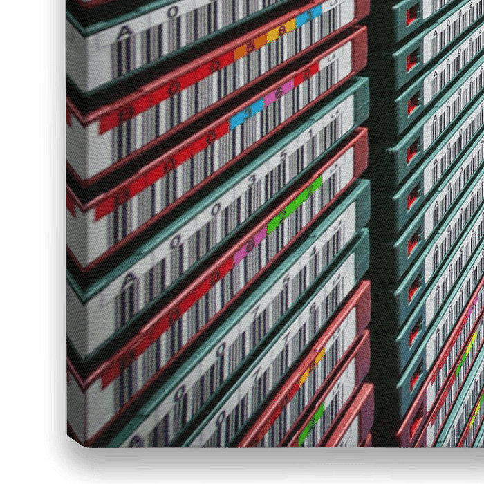 Het interieur van een IBM taperobot volledig gevuld met digitale lineaire tapes (DLT) goed voor de nearline opslag van meerdere petabytes aan gegevens. In operatie is deze robot voortdurend bezig met het optimaliseren van de data over de grote hoeveelheid aan tapes. Deze foto is met een sterke groothoeklens (fisheye) gemaakt door het…