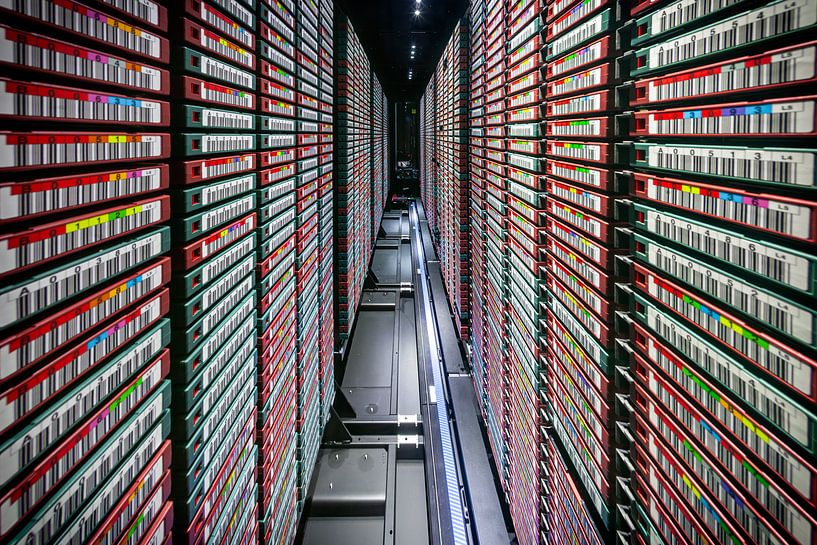 Het interieur van een IBM taperobot volledig gevuld met digitale lineaire tapes (DLT) goed voor de nearline opslag van meerdere petabytes aan gegevens. In operatie is deze robot voortdurend bezig met het optimaliseren van de data over de grote hoeveelheid aan tapes. Deze foto is met een sterke groothoeklens (fisheye) gemaakt door het…