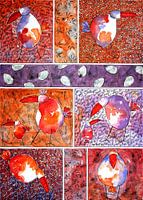 Verzameling vogels met grote snavels. Geschilderd met aquarel en getekend met oostindische inkt. De tekeningen van mijn kinderen zijn voor dit werk als voorbeeld gebruikt.