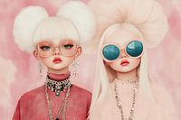 Deze twee dames hebben duidelijk besloten dat minder niet altijd meer is! Met hun volumineuze haar en oversized zonnebrillen zijn ze klaar om de wereld te veroveren – of in ieder geval een glamoureuze theeparty. Hun outfits zijn een mix van retro en futuristisch, met sieraden die meer bling bevatten dan een kroonjuweelshow. De blik in hun ogen (of wat we kunnen zien door die gigantische brillen) zegt: "Ja, we weten dat we fabulous zijn, en jij zou dat ook moeten weten."