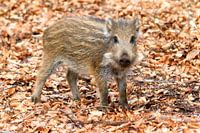 Prachtige opname van een jong biggetje van het wild zwijn (sus scrofa) in nationaal natuurpark de hoge veluwe in de lente