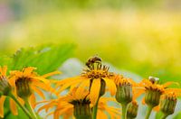 Een bij vliegt van bloem naar bloem en neemt dan stuifmeel mee aan haar poten en lijfje, zij zorgt voor bestuiving zodat de vruchten kunnen groeien, een heel waardevol diertje dus. Deze bij zit op een mooie gele bloem, de Ligularia dentata.