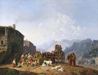 Het paard, gespannen aan een wagen drinkt uit de fontein terwijl de koetsier lijdzaam toekijkt. Voor het bouwwerk enkele geiten en vogels. Rechts staan twee mannen, monniken terwijl reizigers lanstrekken, ze wandelen, komend uit de stadspoort of trekkend met een ezel, een pakezel als lastdier.