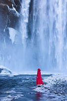 Vrouw in traditionele rode cape bij Skogafoss waterval, IJsland