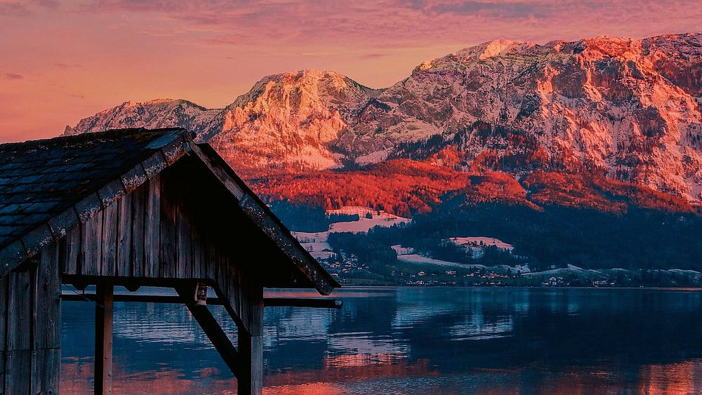 Uitzicht over de zonsondergang van Attersee op de achtergrondberg.