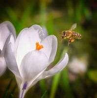 Koop dit bloemen kunstwerk Bij die naar een witte krokusbloem vliegt van ManfredFotos op canvas, aluminium dibond, (ingelijste) fotoprint, behang en ArtFrame, op maat geprint in Fine-Art kwaliteit.