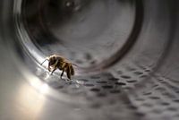 Deze bij trof ik tussen de schone vaat in mijn vaatwasmachine aan. Ik heb hem kunnen redden door hem in een glas te vangen. Nog wel natuurlijk een foto gemaakt.