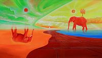 Dit surrealistische schilderij voert de kijker mee naar een bizarre en onwerkelijke wereld waarin de werkelijkheid op fascinerende wijze wordt gespiegeld. De centrale figuur in dit tafereel is ongetwijfeld een rode olifant, op wiens rug een grote boom met imposante wortels groeit, horizontaal gespiegeld ver uit het oorspronkelijke beeld…