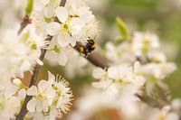 Deze bij / hommel is hard aan het werk in de fruitboomgaard. De bijen en hommels zorgen voor de bestuiving van de bloemen zodat wij straks weer van die heerlijke kersen kunnen genieten. Behalve kersen zorgen de bijen ook voor kersenhoning, een honingsoort met een uiterst bijzondere smaak. De honing smaakt ook echt naar kers.