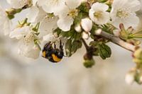 Deze bij / hommel is hard aan het werk in de fruitboomgaard. De bijen en hommels zorgen voor de bestuiving van de bloemen zodat wij straks weer van die heerlijke kersen kunnen genieten. Behalve kersen zorgen de bijen ook voor kersenhoning, een honingsoort met een uiterst bijzondere smaak. De honing smaakt ook echt naar kers.