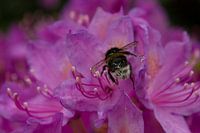 Een honingbij doet zich tegoed aan het stuifmeel en de nectar van een bloeiende paarse clematis.