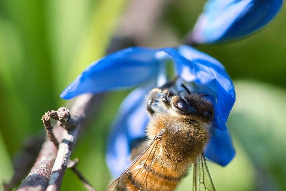 Bij op een bloem die nectar verzamelt. Insect uit de natuur aan het eten. Macro-opname van een insect