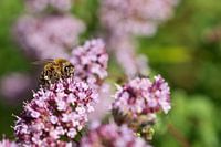 Bij op een bloem die nectar verzamelt. Insect uit de natuur aan het eten. Macro-opname van een insect