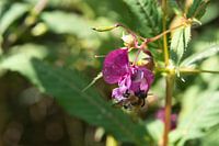 Bij op een bloem die nectar verzamelt. Insect uit de natuur aan het eten. Macro-opname van een insect