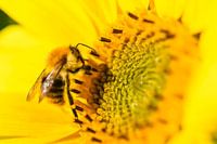 Bij zittend op een zonnebloem tijdens de zomer. Close-up macro-opname met een kleine scherptediepte.