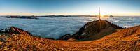Bij zonsondergang komen de Allgäuer Alpen uit de zee van mist tevoorschijn en tonen een geweldige sfeer boven de Grünten.