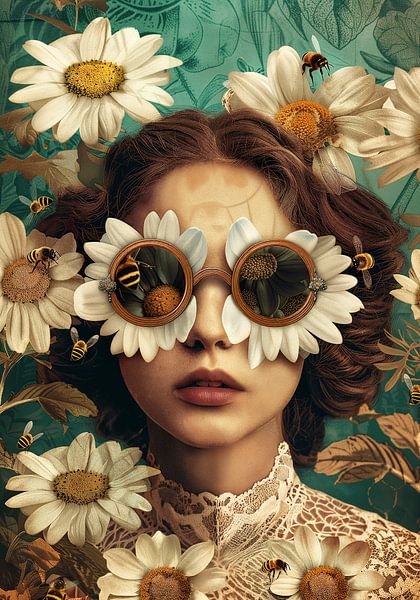Portret van een vrouw met zonnebril omringd door zoemende en dansende bijen op zoek naar honing uit de weelderige witte madeliefjes met geel hart. De kanten jurk van de vrouw is in dezelfde kleurstelling als de bloemen. De achtergrond is mooi in complementerend aquablauw, waarin dunne nerven van bladeren zijn verwerkt. Passend bij…