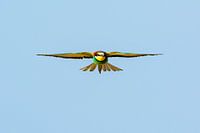 Een bijeneter in vlucht. de vleugels staan in een gelijke horizontale stand, waardoor het beeld mooi rustig oogt.