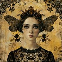 Een jonge vrouw met vleugels als van een bij. Ze draagt een kroon en een kanten blouse. De achtergrond is versierd met gouden ornamenten en bijen. Haar blik is dromerig. Perfect als kunstprint voor aan de muur.