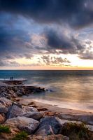 De zon is bijna onder. Na een wegtrekkend regengebied wordt het toch nog even wat lichter, bijna bijbelse luchten, en zien we de zon kleurrijk afscheid nemen van deze dag en nog even reflecteren op de vlakke zee en de natte rotsen..
