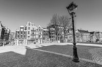 Bijna verlaten Torensluisbrug aan het Singel in Amsterdam tijdens een doordeweekse ochtend. De brug en de straten zijn leeg vanwege de COVID-19 pandemische coronavirussluiting. Zwart-wit beeld.