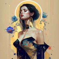 Bijzonder en modern geïllustreerd portret: "I'm a dreamer". Prachtige warme kleuren en botanische elementen (bloemen) geven dit portret een dromerige sfeer en uitstraling. Met dit werk heb je echt iets bijzonders te pakken voor aan je muur!
